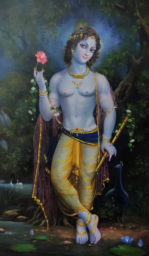 | Oh, Lord Śrīkṛṣṇa! I deeply crave for seeing Your immense form filled with unbounded smiles, long-drawn lotus-petal-like eyes, lovingly pressed without reservation by the bosoms of all the Vraja damsels, manifesting limitless glow of the divine blue luminence, the form that suffuses all the three worlds in creation! |